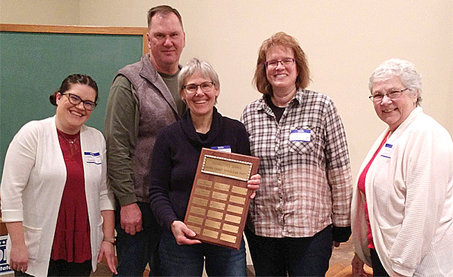 Judy Hahn (center) of New Ulm is holding the engraved traveling plaque moments after receiving the 2022 Brown County Republican Distinguished Service Award during the Brown County Republican Convention on March 19. She is surrounded by prior awardees, from left: Jenny Spurgin (2021), New Ulm, Kris Schneeberg (2019), New Ulm, Beth Griffis (2020), Springfield, Gerane Spurgin (2021) New Ulm. This honor recognizes dedication and leadership to county-wide initiatives, including fundraisers, public relations and candidate campaigns. Hahn currently serves as treasurer for the Brown County Republicans