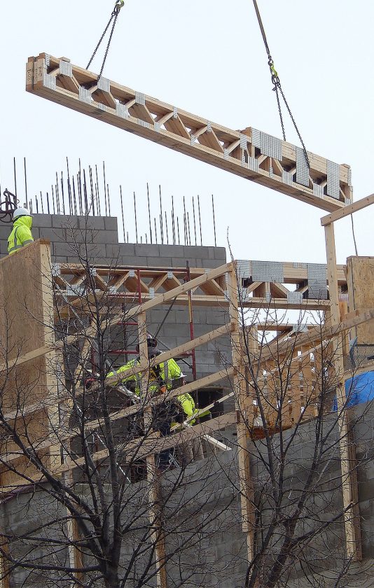 Despite a 24 mph southeast wind, construction workers set wooden beams in place Tuesday at the Inspire Weddings+Events construction site at 126 N. Minnesota St. Construction fans can follow the project’s progress on Facebook.