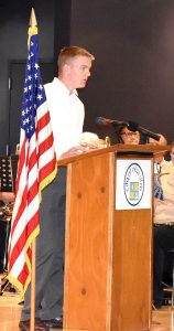 Staff photo by Clay Schuldt Recent Cathedral High School graduate August Fliszar gives the Memorial Day speech at the New Ulm Community Center. He asked everyone to remember those who served and keep history alive.