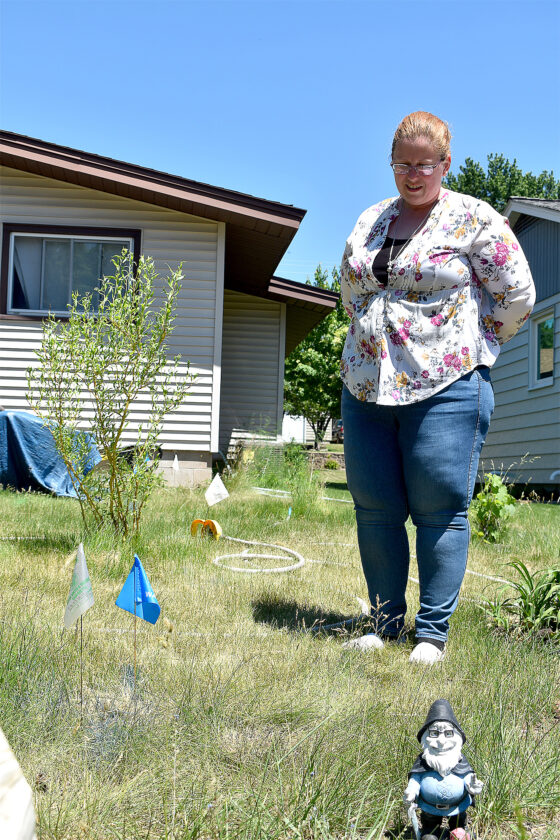 Staff photo by Clay Schuldt KayLeigh Maurer stands in her yard next to the flags and blue striping marking the water line that will need to be replaced.