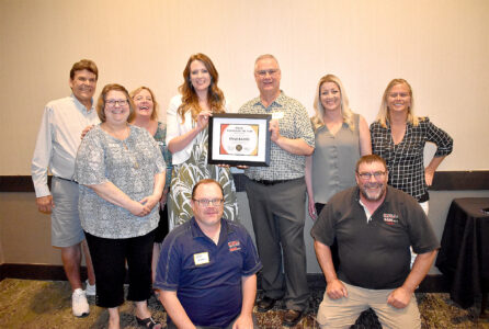 Staff photo by Clay Schuldt KNUJ Staff accepts the Small Business of the Year award from the New Ulm Chamber of Commerce. From left, back row: Crag Hansen, Sandy Scheibel, Christy Poss, Chamber CEO Sarah Warmka, Brian Filzen, Wendy Forst and Amanda Erickson. FRONT: Todd Olson and Tom Wheeler.