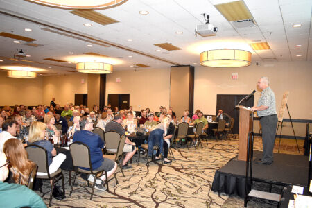 Staff photo by Clay Schuldt KNUJ Program Manager Brian Filzen served dual roles during the Business of the Year Banquet as the Master of Ceremonies and award recipient along with the rest of the KNUJ staff. Filzen said he sincerely could not work with a better staff than his co-workers at KNUJ.