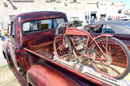 Staff photo by Clay Schuldt The 1955 Ford F100 is a classic all on its own, but with an almost early model of an Indian motorcycle in the flatbed, its a priceless artifact of history.