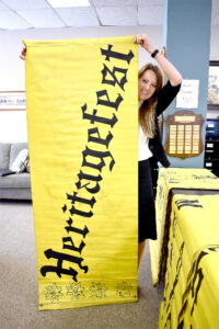 Staff photo by Clay Schuldt New Ulm Area Chamber of Commerce President Sarah Warmka holds up a vintage banner for Heritagefest, now known as Bavarian Blast. This banner and other items are available at the Chamber’s rummage sale