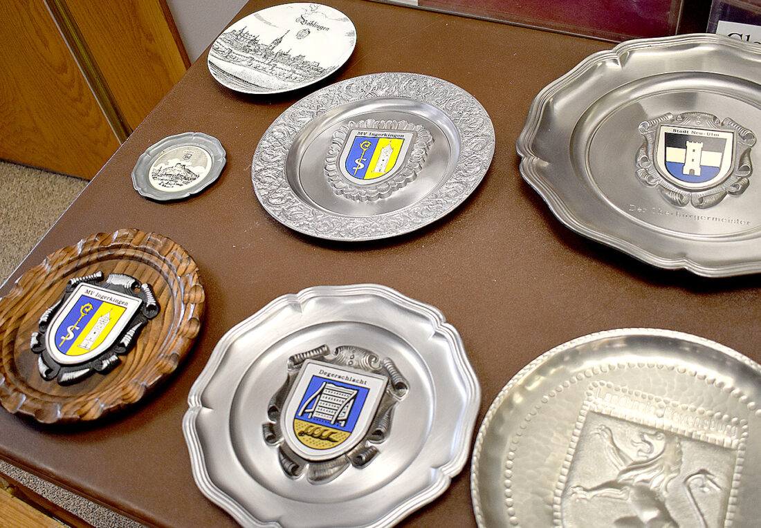 Staff photo by Clay Schuldt A table full of German coat of arms plates are among the vintage items at the Chamber of Commerce rummage sale