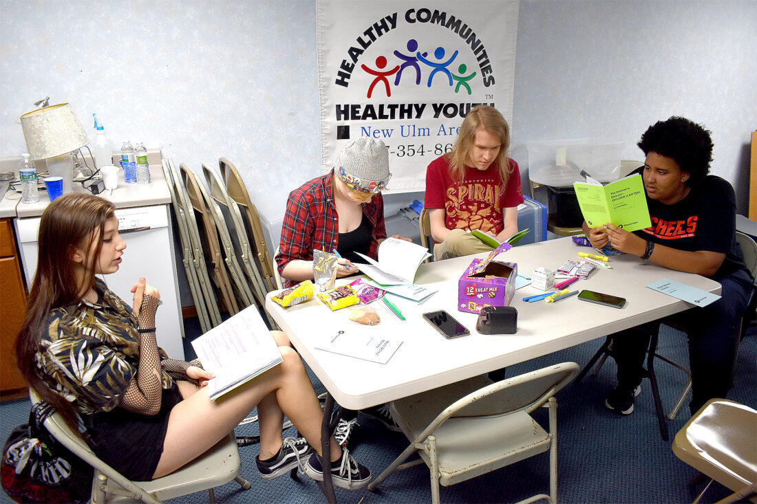 Staff photo by Clay Schuldt From left, Emmie Stangel, Jayda Goold, Grahm Wilkins and Brianna Prescott hold a table reading in the Healthy Communities Healthy Youth offices in preparation for their Friday performance at The Grand.