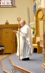 Staff photo by Clay Schuldt Cardinal Jean-Claude Hollerich of Luxembourg delivers the sermon during Sunday’s morning mass at Cathedral of the Holy Trinity.