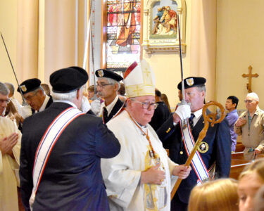 - Staff photo by Clay Schuldt Cardinal Jean-Claude Hollerich, archbishop of Luxembourg, exits Cathedral flanked by members of the Knights of Columbus.