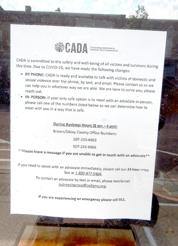 Photo by Fritz Busch This sign in the window of Keep Me Safe, a supervised visitation center that operates through the Committee Against Domestic Abuse, offers directions on how domestic violence victims and their children can get help. Keep Me Safe recently notified that Brown County Human Services Department that it will close its New Ulm office due to a lack of funding support from the state.