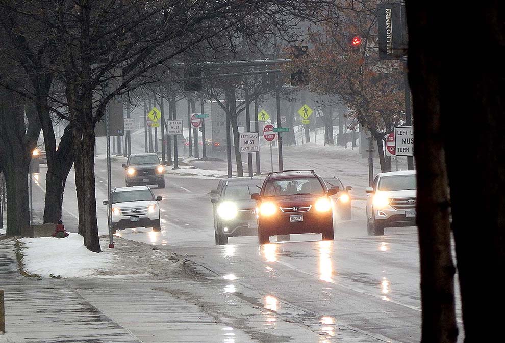 Staff photo by Fritz Busch Broadway drivers deal with a downpour Tuesday afternoon. The National Weather Service forecast nearly a half inch of rainfall with a high of 35 degrees in New Ulm Tuesday. Wednesday’s forecast has a high of 37 degrees under cloudy skies.