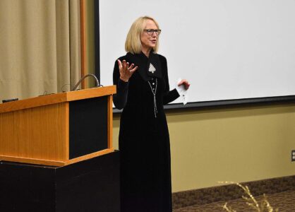 Former NUMC Inpatient RN Care Coordinator Laurie Austvold, speaks during a special ceremony honoring her as the 2022 recipient of the Legend of Medicine award.