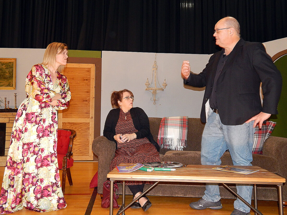 Staff photo by Fritz Busch Morgan Community Players (from left) Amanda Mathiowetz (Southern belle Paula), Kristin Rossow (Fiona) and Doug Daub (Jordan) rehearse for the Morgan Community Play March 3-5 in the former Morgan High School gym.