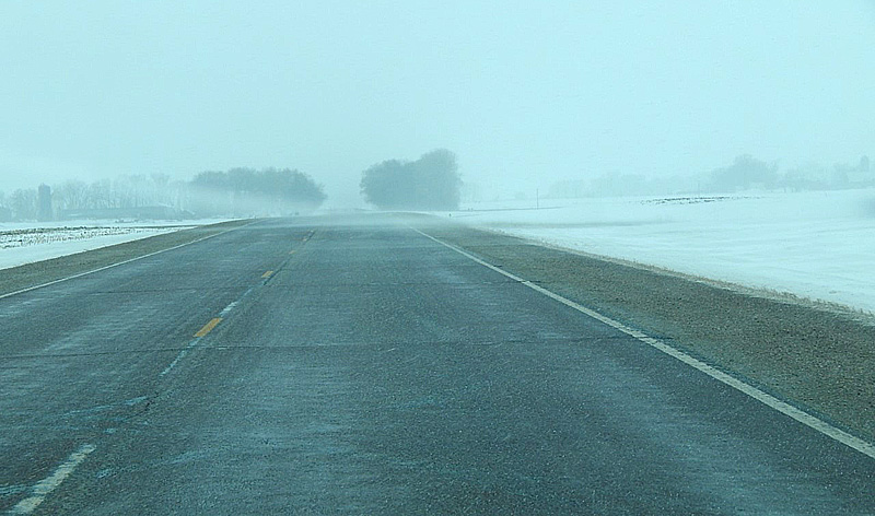 Staff photo by Fritz Busch Frozen rain and blowing snow begin covering Brown County Highway 27 early Thursday afternoon. The Minnesota State Patrol closed U.S. Highway 14 from five miles east of Tyler to one mile east of Tracy at 11:24 a.m. Thursday due to poor driving conditions.