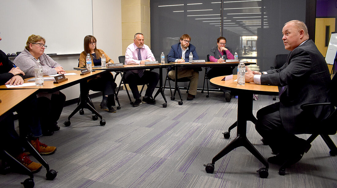 - Below, candidate Randal Berquist talks with community members as part of the interviews held Monday at the New Ulm High School.