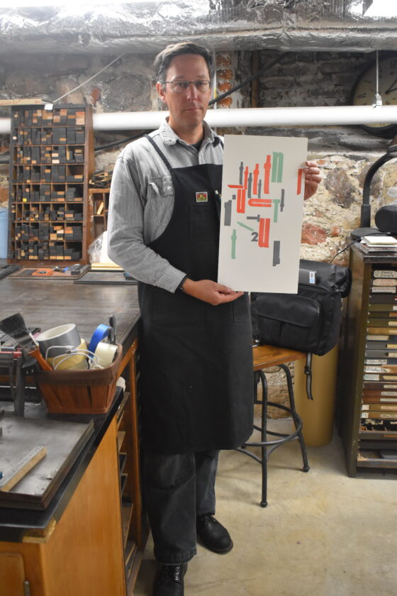 Brad Coulter shows off his favorite piece in the Cellar Press at The Grand. The piece was one of the first he created, creating a colored and typed response to a thunderstorm heard from the cellar.