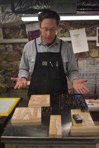 - Brad Coulter shows off some of the wood blocks he has created for his letter press artwork. The letters start from very small models and can take on varied forms when finished.