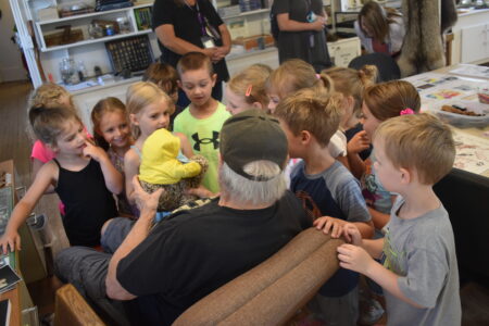 Kindergarten Kickstart kids gather around as Curator Dan Bolduan showcases a sloth at the Riverside History and Nature Center. The sloth listened to what the kids said and repeated it back to them.