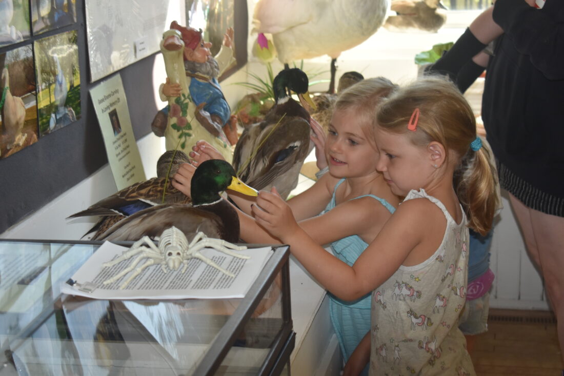 - Vivian Bauer (left) and Holly Zabel (right) look at a Mallard as Zabel touches its beak at the Riverside Nature and History Center. The kids were encouraged to touch the different exhibits as long as they were careful.