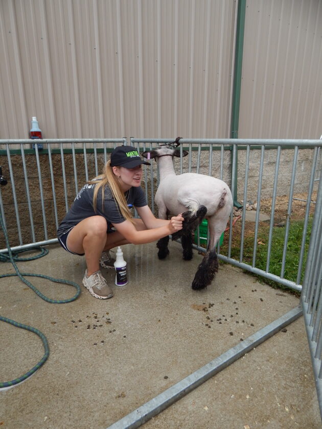 Staff photo by Fritz Busch Comfrey Comets and Brown County 4H Ambassador Hailey Green washes up “Karen,” one of her sheep at the Brown County Fair Wednesday. The county fair sheep and goat show starts at 3:30 p.m. today.