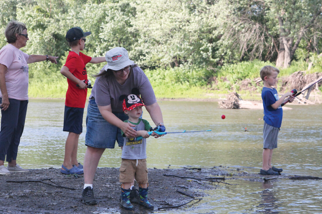 Staff photo by Travis Rosenau Two-year-old Matthew Honstad casts his line into the Minnesota River with the help of his aunt Mandy Griebel during the Get Hooked on Fishing! 23rd Annual Free Fishing Contest Wednesday at Riverside Park in New Ulm. For more information and photos from the event, see the sports section on page 12A.