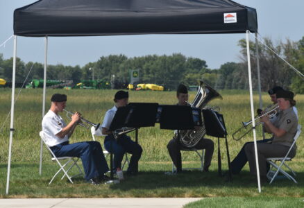 The 34th Infantry Red Bull Band perform a musical selection during the dedication ceremony Saturday. Tents were added at the last minute to shield all participants and attendees from the sweltering heat.