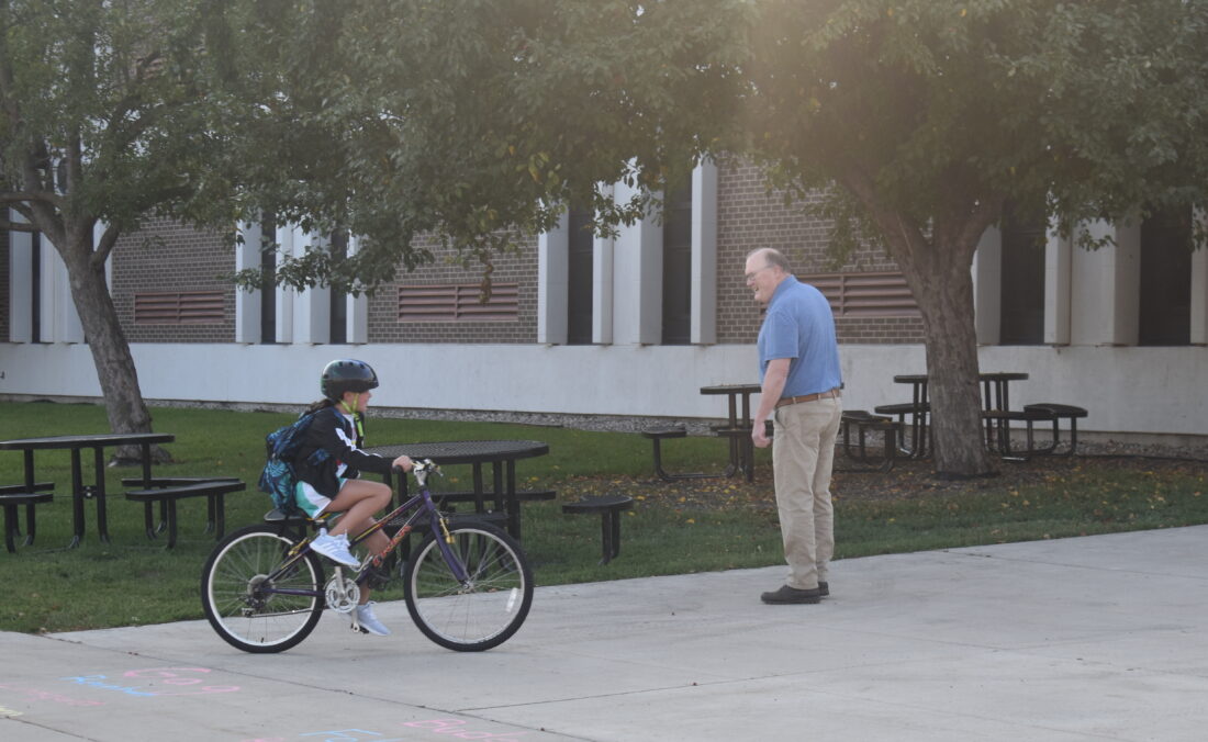 Agriculture and Information Technology teacher Scott Stuckey welcomes a fifth grader on their bicycle as school starts for the New Ulm Public Schools Monday. Only the fifth and ninth graders started Monday, while all grades minus kindergarten start Tuesday.