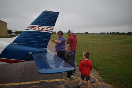 - Angie Zeig (left) explains to her two kids Andrew (middle) and Anthony (right) what a rudder does for an airplane as they and Angie’s husband Jesse enjoy the fly-in breakfast.