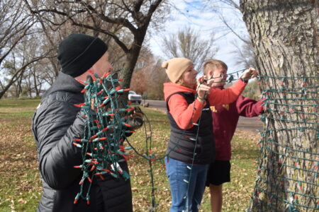 - Cory, Ashley, and Owen Rasche (L-R) work to wrap Christmas lights around tree trunks in Sportsman’s Park Sunday. Owen Rasche said the volunteering will help with his experience hours for confirmation.