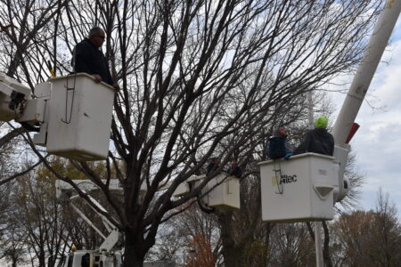 Sleepy Eye Holiday Lights co-founder Mike Seuss (left cab), Loran Ludewig and Cory Heiderscheidt (middle cab), and Justin Hendricksen with Al Felber (right cab) coordinate to wrap a string of lights around a tree in Sportsman’s Park. Seuss said the hardest part is finding volunteers willing to go high up in the cabs.