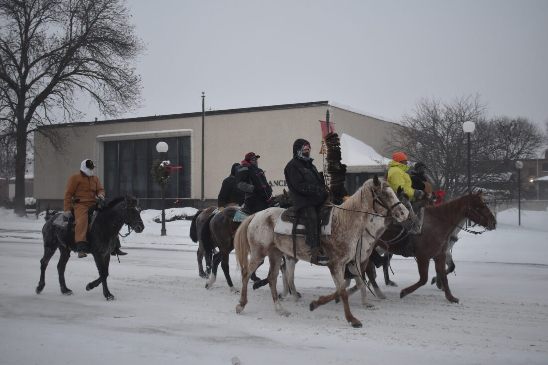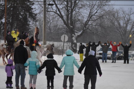 - The crowd waves and clasp their hands as the 38+2 Reconciliation Ride led by Staff Holder Wilfred Keeble walks through New Ulm Dec. 23, 2022. Keeble said the ride has helped many throughout the years work through generational trauma.