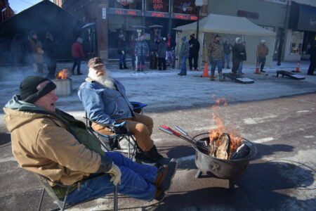 Event volunteers Mike Finstad of New Ulm and David Weidner of Hector tended hot irons in a fire-pit with wood logs on Minnesota Street. Finstad says he’s just warming up for beer poking duties at Bockfest the first Saturday in March.