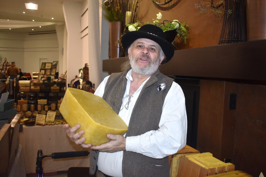 Woodworker Roger Pilsner holds a 21-pound slab of beeswax available for sale at his station during the New Ulm Trade Fair and Living History event Sunday. Pilsner said 100% pure beeswax has over 50 applications, including to lubricate stuck zippers and as a sealant.