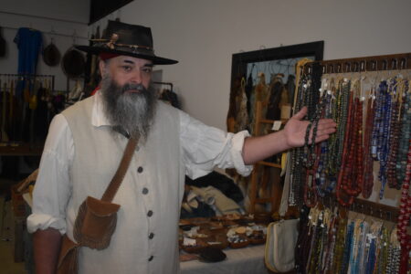 Brent Wilson showcases one strand out of many beads showcased at the New Ulm Trade Fair and Living History event Sunday. He said that strand in particular were Roman Egyptian beads from 2,000 years ago.