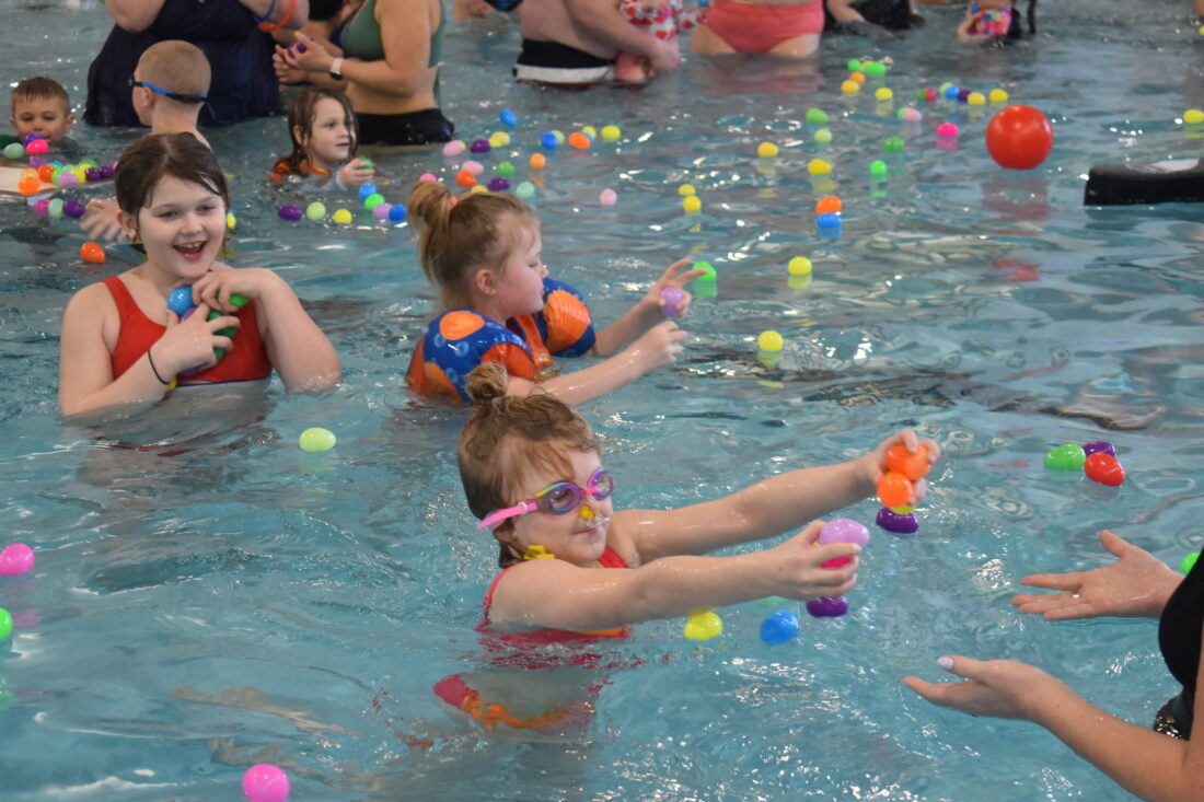 Nearly 100 children participate in the Pool Eggstavaganza at the New Ulm Recreation Center Friday. Participants include Abigail Hoffman in the foreground and Mikenna, left, and Libby Hoffman, all of New Ulm in back. The New Ulm Park and Recreation Dept. announced Friday that Saturday’s Easter Egg Hunt was moved from Harman Park to the New Ulm Civic Center, 1212 N. Franklin St.. Doors open at 10 a.m. for activities including photos with the Easter Bunny. The hunt begins at 10:30 a.m.