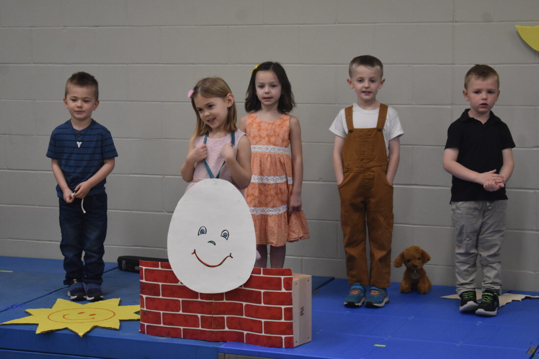 St. Paul Preschool students recite the classic nursery rhyme of Humpty Dumpty. (L to R) Jett Griebel, Joelle Nilson, Eloise Price, Henry Behnken and Brooks Gawrisch.
