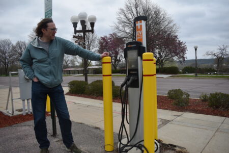 - Staff photo by Fritz Busch New Ulm Public Utilities Energy Services Rep. Derek Nelson takes a close look at the city-owned electric vehicle (EV) charging station at the corner of 2nd North and German St.