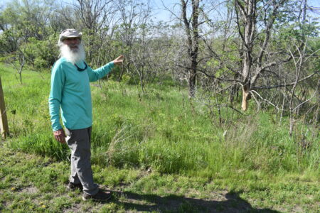 - Joe Gertner points out a severely affected Emerald Ash Borer tree at Pollinator Park.