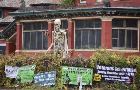 The front yard of Nick Brown and Lexie MaCann’s home is overrun with skeletons. Some tower over their Payne Street home, others crawl out of the ground, and at least one is riding a horse.