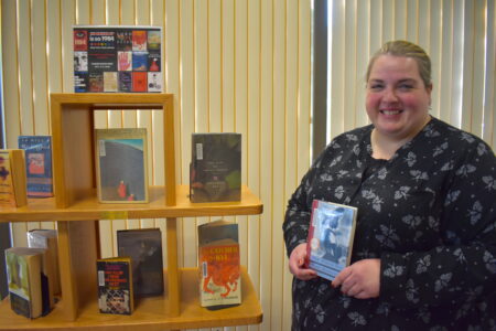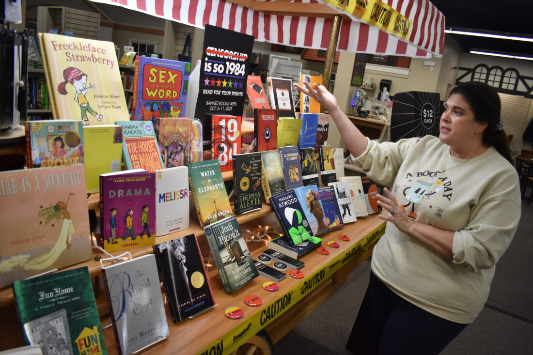 Tamara Klawitter shows Lykke Books display for Banned Books Week. Klawitter said the display is a conversation starter with patrons who have read some of the books or are interesting reading the others.