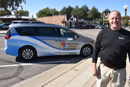 Staff photo by Fritz Busch Elmer Rettig of Amilla Care Transport is pictured with his minivan ready to provide rides in New Ulm this weekend.