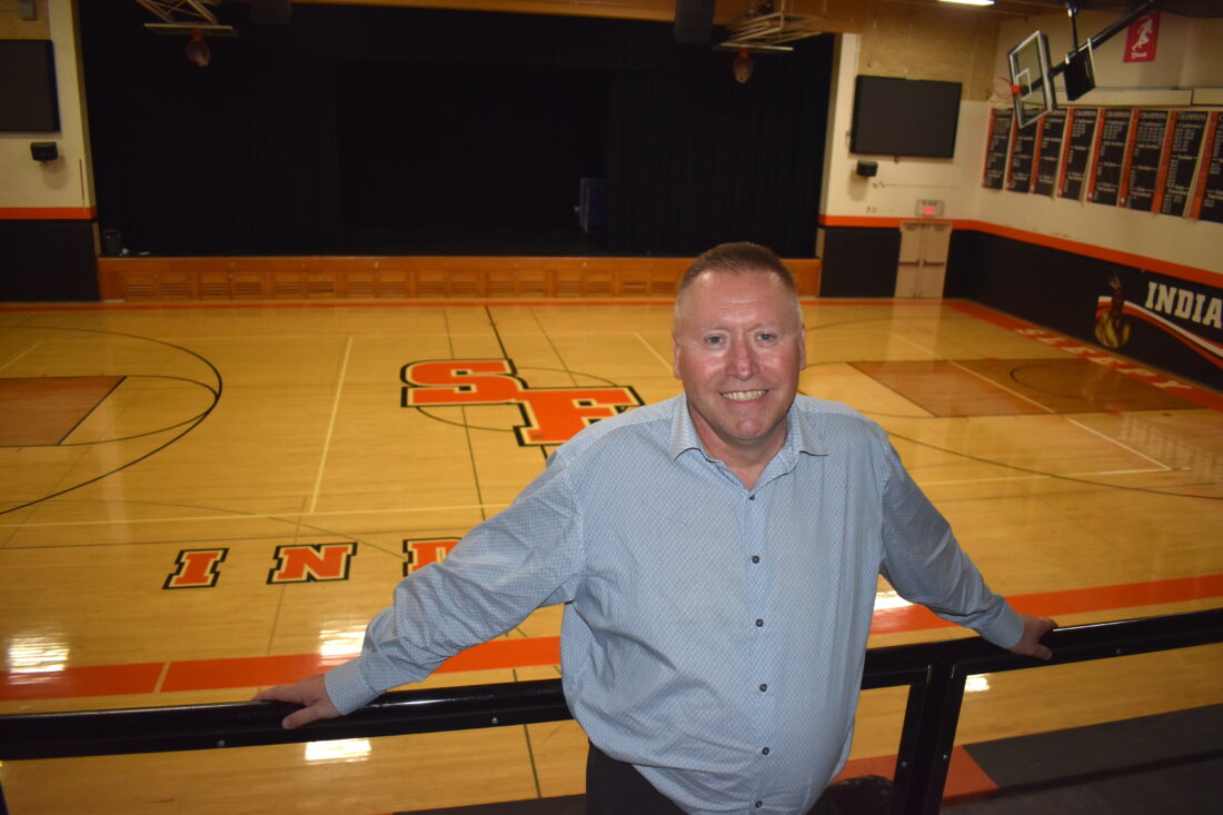 Staff photo by Fritz Busch Sleepy Eye/Cedar Mountain Public Schools Superintendent John Cselovszki stands in the Sleepy Eye High School gym balcony. The school board unanimously approved a school buildings and sites naming rights policy Wednesday.