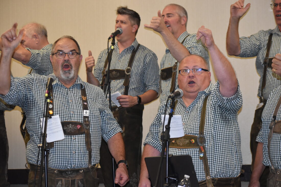 - Staff photo by Fritz Busch Concord Singers front from left, Ron Forst and Brent Roiger gesture with Oktoberfest music at the Best Western Plus Friday.