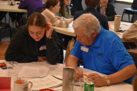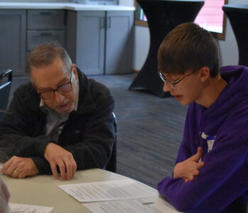 New Ulm Rotary Club member Kevin Sweeney goes over the business ethics material with high school student Noah Braun during the club’s annual ethics workshop.