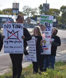 - From left to right: Emmie Turner, Lilah Hein, Amanda Harkcom and Alex Schottle holds signs during the New Ulm No Kings rally. Emmie Turner said her reason for attending was out of compassion and empathy for others. “It isn’t just about me and what is happening in my backyard,” she said.