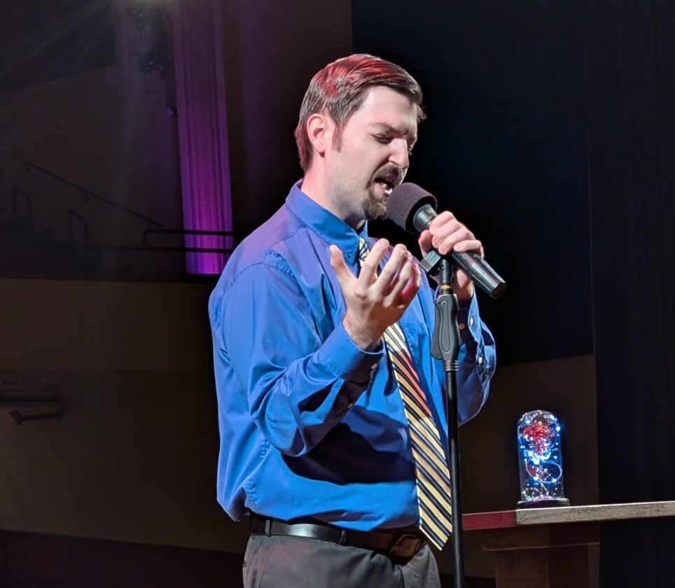 Derek Helget performs “If I Can’t Love Her” from ‘Beauty and the Beast,’ with enchanted rose off to the side. A Briar Cliff University theater graduate, Helget also performed “Some Enchanted Evening” from South Pacific.