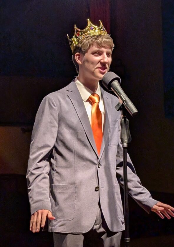 Jared Gleisner channels royal flair in “You’ll Be Back” from “Hamilton,” complete with crown and charisma. A New Ulm Cathedral graduate now studying computer science at Benedictine College, Gleisner also performed “Dancing Through Life” from Wicked.