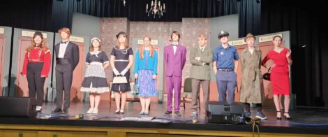 Everyone in MVL’s production of “Clue” is shocked when another victim drops. L to R: Liz Halvorson as Mrs. Peacock, Lucy Hines as Miss Scarlet, Maddie Meitner as Yvette, Abraham Selvey as Prof. Plum, Paige Berg as Mrs. White, Ezra Spike as Mr. Green, Will Kerkow as Wadsworth, Oliver Nelson as Cop and Judah Geunther (on ground) as Motorist. Photo by Amy Zents