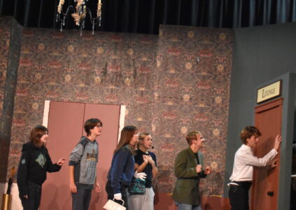 The cast of Minnesota Valley Lutheran’s fall musical “Clue” rehearses a scene in which they cannot get into the Lounge. From left to right: Maddie Meitner as Yvette, Abraham Selvey as Prof. Plum, Paige Berg as Mrs. White, Liz Halvorson as Mrs. Peacock, Ezra Spike as Mr. Green and Will Kerkow as Wadsworth. Photo by Clay Schuldt