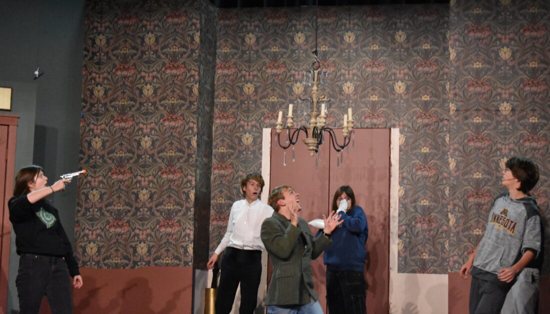 The cast of MVL’s fall play “Clue” gathers around Ezra Spike, playing Mr. Green, who was just hit by a chandelier. Maddie Meitner as Yvette, Paige Berg as Mrs. White, Will Kerkow as Wadsworth, Ezra Spike as Mr. Green on the ground, Abraham Selvey as Prof. Plum lifting the chandelier and Liz Halvorson as Mrs. Peacock. Photo by Clay Schuldt