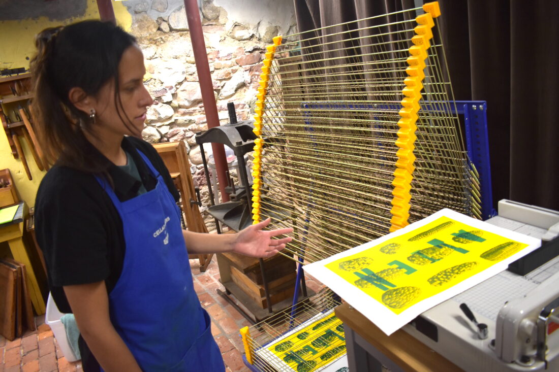 - Artist Lynda Grafito stands near the drying rack in The Grand Cellar Press. She said printmaking involve a lot of experimenting and the end product can be a surprise.